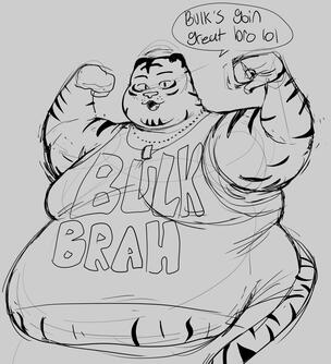 Height: 6'5"ishWeight: Variable, starts thin and muscular, ends up in a variety of sizes that are all BIG. At least 500 lbs. Still convinced he's, like, 270 lbs.Niche: Fat jock, WG denial, himbo, my "fursona".